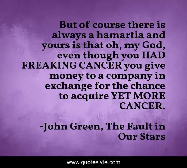 This page presents the quote "But of course there is always a hamartia and yours is that oh, my God, even though you HAD FREAKING CANCER you give money to a company in exchange for the chance to acquire YET MORE CANCER.". Author of this quote is John Green, The Fault in Our Stars. This quote is about cigarettes, cancer, fatal-flaw,.