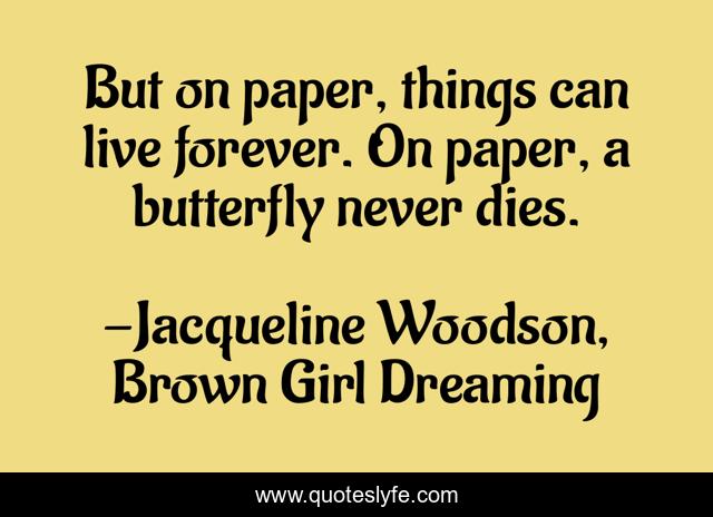 This page presents the quote "But on paper, things can live forever. On paper, a butterfly never dies.". Author of this quote is Jacqueline Woodson, Brown Girl Dreaming. This quote is about butterfly, butterflies, death, writing,.