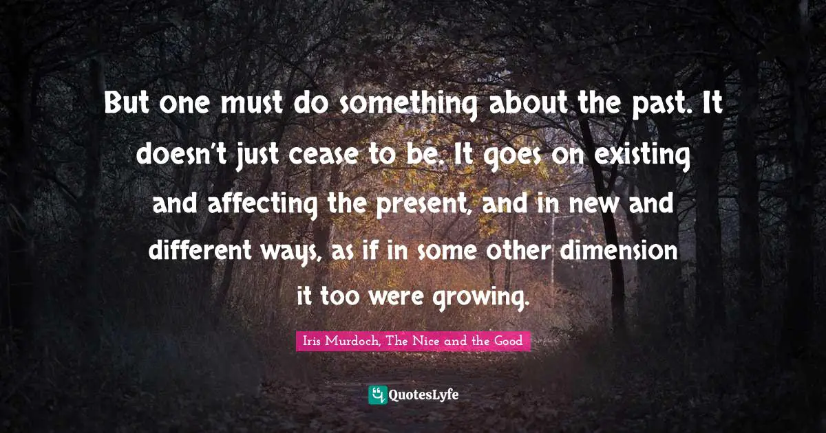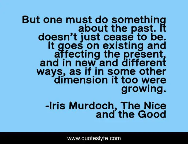 This page presents the quote "But one must do something about the past. It doesn’t just cease to be. It goes on existing and affecting the present, and in new and different ways, as if in some other dimension it too were growing.". Author of this quote is Iris Murdoch, The Nice and the Good. This quote is about closure, past,.