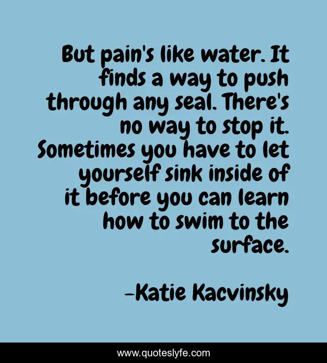 This page presents the quote "But pain's like water. It finds a way to push through any seal. There's no way to stop it. Sometimes you have to let yourself sink inside of it before you can learn how to swim to the surface.". Author of this quote is Katie Kacvinsky. This quote is about emotional-wounds, pain, healing-the-past, emotional-health, emotions, suffering, healing, mental-illness, emotional-pain,.