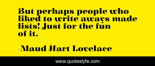 This page presents the quote "But perhaps people who liked to write aways made lists! Just for the fun of it.". Author of this quote is Maud Hart Lovelace. This quote is about writing-life, list,.