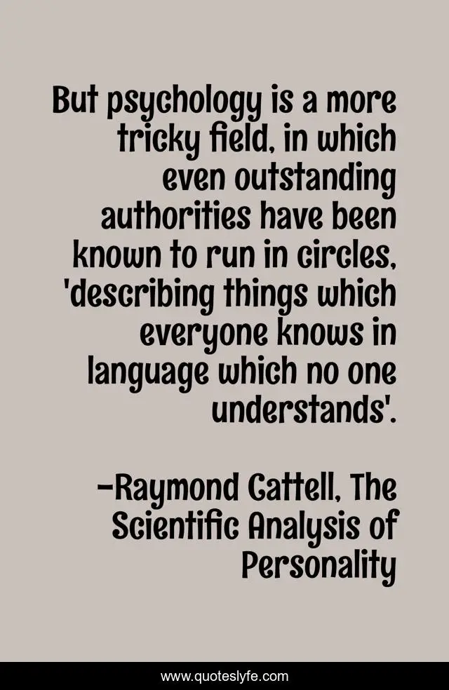 This page presents the quote "But psychology is a more tricky field, in which even outstanding authorities have been known to run in circles, 'describing things which everyone knows in language which no one understands'.". Author of this quote is Raymond Cattell, The Scientific Analysis of Personality. This quote is about tricky, psychology, language, science, understanding, authorities,.