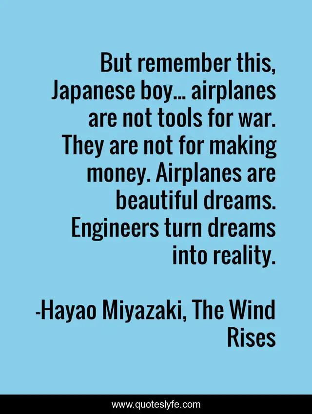 This page presents the quote "But remember this, Japanese boy... airplanes are not tools for war. They are not for making money. Airplanes are beautiful dreams. Engineers turn dreams into reality.". Author of this quote is Hayao Miyazaki, The Wind Rises. This quote is about engineering, airplanes, war,.