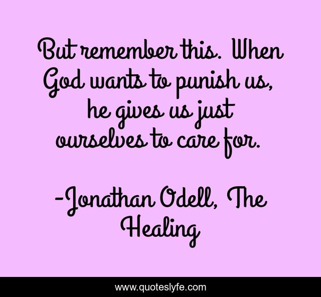 This page presents the quote "But remember this. When God wants to punish us, he gives us just ourselves to care for.". Author of this quote is Jonathan Odell, The Healing. This quote is about grief, loneliness, helping-others,.