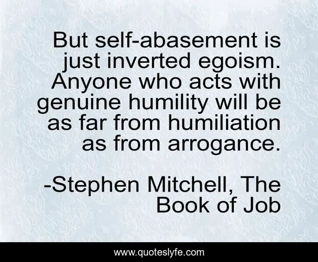 This page presents the quote "But self-abasement is just inverted egoism. Anyone who acts with genuine humility will be as far from humiliation as from arrogance.". Author of this quote is Stephen Mitchell, The Book of Job. This quote is about arrogance, self-abasement, egoism, humility,.