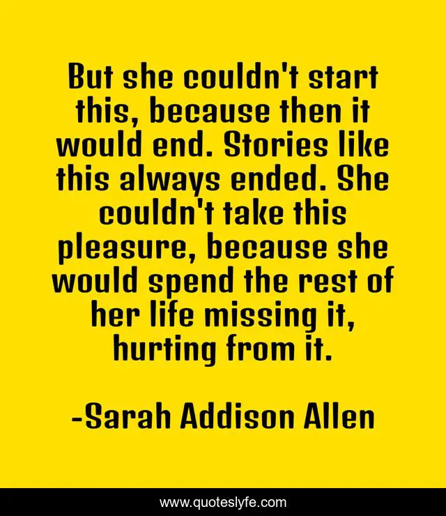 This page presents the quote "But she couldn't start this, because then it would end. Stories like this always ended. She couldn't take this pleasure, because she would spend the rest of her life missing it, hurting from it.". Author of this quote is Sarah Addison Allen. This quote is about endings, love, affection, hurt,.