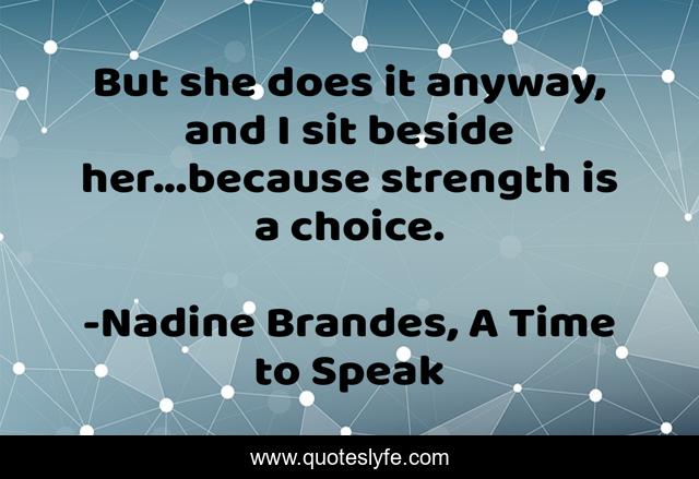 This page presents the quote "But she does it anyway, and I sit beside her...because strength is a choice.". Author of this quote is Nadine Brandes, A Time to Speak. This quote is about strenght, choices,.