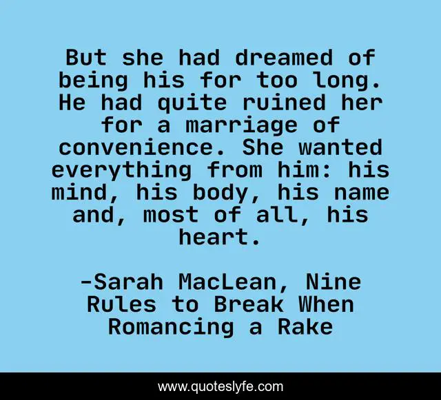 This page presents the quote "But she had dreamed of being his for too long. He had quite ruined her for a marriage of convenience. She wanted everything from him: his mind, his body, his name and, most of all, his heart.". Author of this quote is Sarah MacLean, Nine Rules to Break When Romancing a Rake. This quote is about longing, love, affection,.