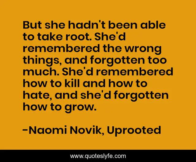 This page presents the quote "But she hadn't been able to take root. She'd remembered the wrong things, and forgotten too much. She'd remembered how to kill and how to hate, and she'd forgotten how to grow.". Author of this quote is Naomi Novik, Uprooted. .
