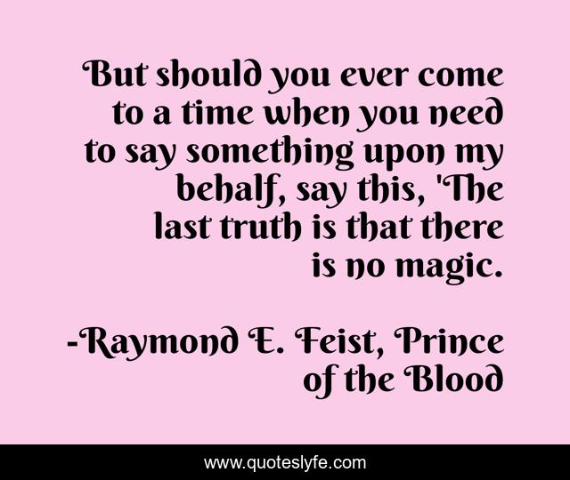 This page presents the quote "But should you ever come to a time when you need to say something upon my behalf, say this, 'The last truth is that there is no magic.". Author of this quote is Raymond E. Feist, Prince of the Blood. This quote is about magic, truth,.