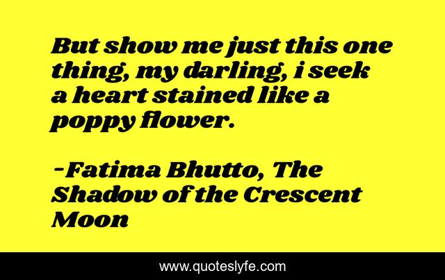 This page presents the quote "But show me just this one thing, my darling, i seek a heart stained like a poppy flower.". Author of this quote is Fatima Bhutto, The Shadow of the Crescent Moon. This quote is about desire, addiction, love, affection,.