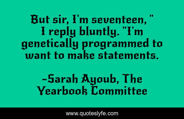 This page presents the quote "But sir, I'm seventeen, " I reply bluntly. "I'm genetically programmed to want to make statements.". Author of this quote is Sarah Ayoub, The Yearbook Committee. This quote is about books, reading, teenagers,.