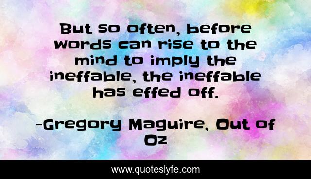 This page presents the quote "But so often, before words can rise to the mind to imply the ineffable, the ineffable has effed off.". Author of this quote is Gregory Maguire, Out of Oz. This quote is about ineffable, words,.