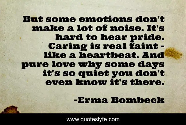 This page presents the quote "But some emotions don't make a lot of noise. It's hard to hear pride. Caring is real faint - like a heartbeat. And pure love why some days it's so quiet you don't even know it's there.". Author of this quote is Erma Bombeck. .