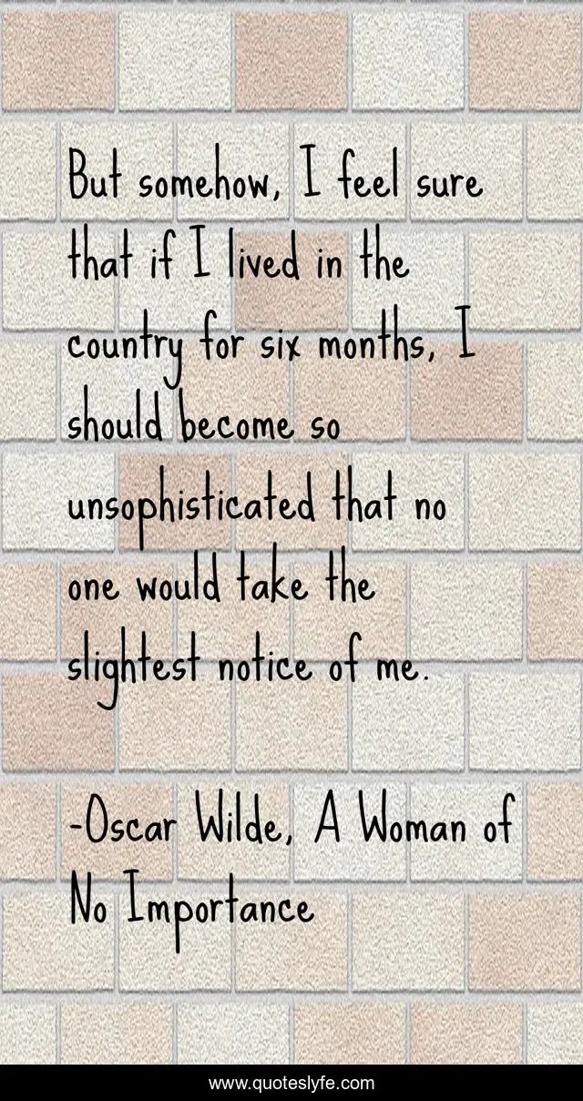 This page presents the quote "But somehow, I feel sure that if I lived in the country for six months, I should become so unsophisticated that no one would take the slightest notice of me.". Author of this quote is Oscar Wilde, A Woman of No Importance. This quote is about desire, woman,.