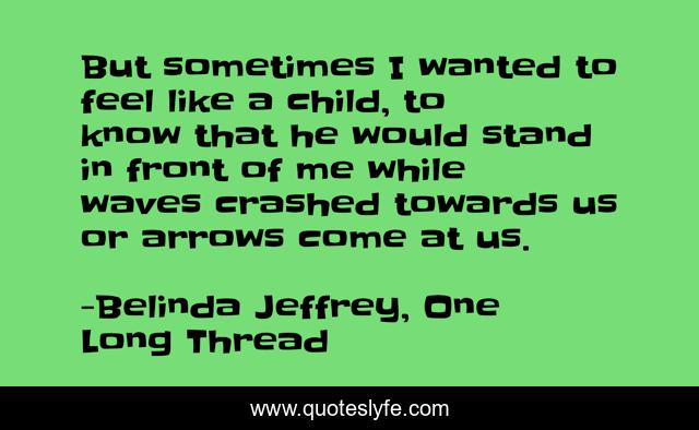 This page presents the quote "But sometimes I wanted to feel like a child, to know that he would stand in front of me while waves crashed towards us or arrows come at us.". Author of this quote is Belinda Jeffrey, One Long Thread. This quote is about protect, father, child,.