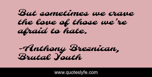This page presents the quote "But sometimes we crave the love of those we’re afraid to hate.". Author of this quote is Anthony Breznican, Brutal Youth. This quote is about hate, love, affection,.