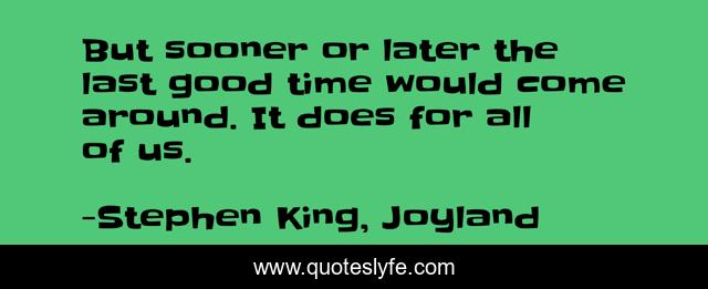 This page presents the quote "But sooner or later the last good time would come around. It does for all of us.". Author of this quote is Stephen King, Joyland. This quote is about crime-fiction, mystery,.