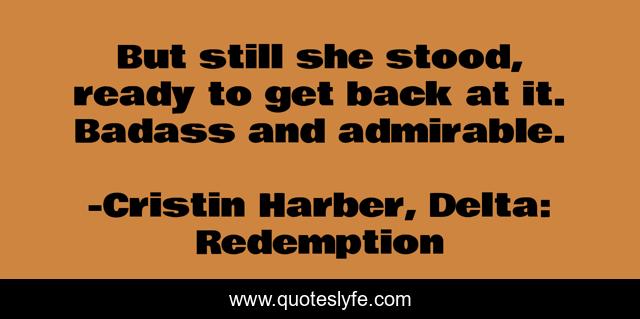 This page presents the quote "But still she stood, ready to get back at it. Badass and admirable.". Author of this quote is Cristin Harber, Delta: Redemption. This quote is about alpha-male, romance, badass-women, romantic-suspense, aussie-hero, badass,.