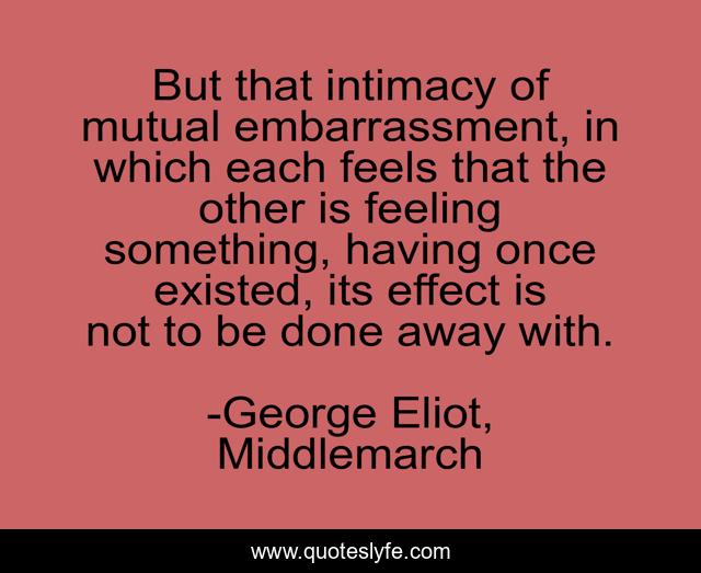 This page presents the quote "But that intimacy of mutual embarrassment, in which each feels that the other is feeling something, having once existed, its effect is not to be done away with.". Author of this quote is George Eliot, Middlemarch. This quote is about embarrassment, intimacy, feeling, love, affection,.