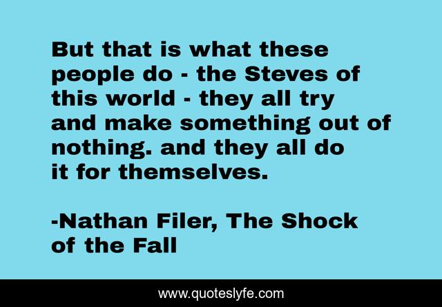 This page presents the quote "But that is what these people do - the Steves of this world - they all try and make something out of nothing. and they all do it for themselves.". Author of this quote is Nathan Filer, The Shock of the Fall. This quote is about mental-health-professionals, mental-health, care,.