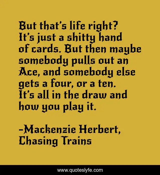 This page presents the quote "But that’s life right? It’s just a shitty hand of cards. But then maybe somebody pulls out an Ace, and somebody else gets a four, or a ten. It’s all in the draw and how you play it.". Author of this quote is Mackenzie Herbert, Chasing Trains. This quote is about metaphor, mackenzie-herbert, ace, life-lessons, cards, life-philosophy, chasing-trains,.