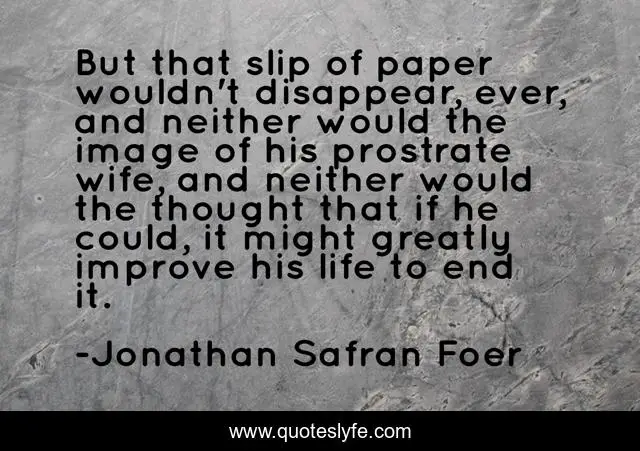 This page presents the quote "But that slip of paper wouldn't disappear, ever, and neither would the image of his prostrate wife, and neither would the thought that if he could, it might greatly improve his life to end it.". Author of this quote is Jonathan Safran Foer. This quote is about grief, infidelity, permanence, suicide,.
