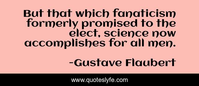 This page presents the quote "But that which fanaticism formerly promised to the elect, science now accomplishes for all men.". Author of this quote is Gustave Flaubert. This quote is about religion, science,.