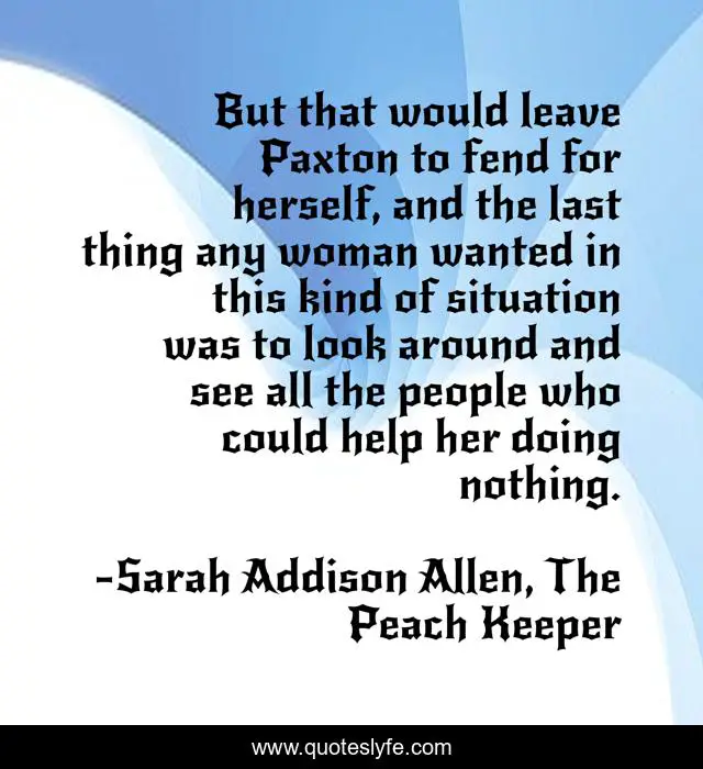 This page presents the quote "But that would leave Paxton to fend for herself, and the last thing any woman wanted in this kind of situation was to look around and see all the people who could help her doing nothing.". Author of this quote is Sarah Addison Allen, The Peach Keeper. This quote is about friendship, women,.