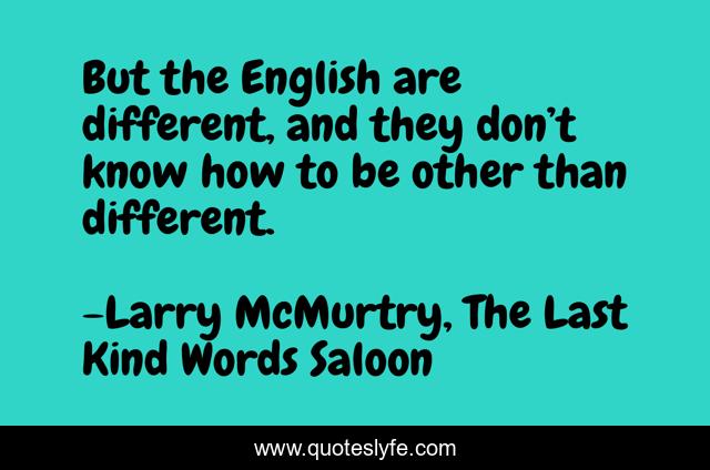 This page presents the quote "But the English are different, and they don’t know how to be other than different.". Author of this quote is Larry McMurtry, The Last Kind Words Saloon. This quote is about different, english,.