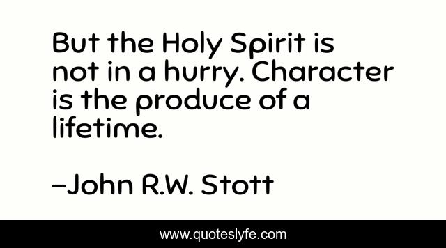 This page presents the quote "But the Holy Spirit is not in a hurry. Character is the produce of a lifetime.". Author of this quote is John R.W. Stott. This quote is about john-stott, character, holy-spirit,.