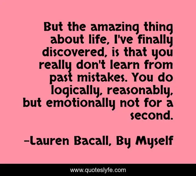 This page presents the quote "But the amazing thing about life, I've finally discovered, is that you really don't learn from past mistakes. You do logically, reasonably, but emotionally not for a second.". Author of this quote is Lauren Bacall, By Myself. .