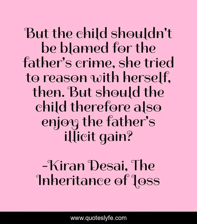This page presents the quote "But the child shouldn't be blamed for the father's crime, she tried to reason with herself, then. But should the child therefore also enjoy the father's illicit gain?". Author of this quote is Kiran Desai, The Inheritance of Loss. .