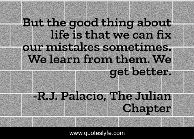 This page presents the quote "But the good thing about life is that we can fix our mistakes sometimes. We learn from them. We get better.". Author of this quote is R.J. Palacio, The Julian Chapter. This quote is about enthusiasm, life, mistakes, inspirational,.
