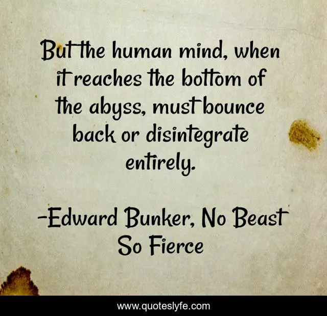 This page presents the quote "But the human mind, when it reaches the bottom of the abyss, must bounce back or disintegrate entirely.". Author of this quote is Edward Bunker, No Beast So Fierce. This quote is about mental-health, resilience,.