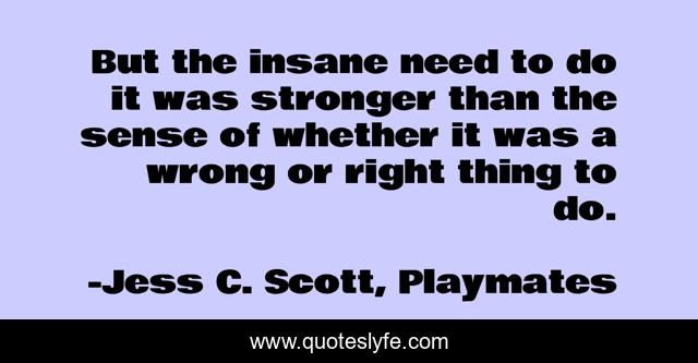 This page presents the quote "But the insane need to do it was stronger than the sense of whether it was a wrong or right thing to do.". Author of this quote is Jess C. Scott, Playmates. This quote is about conscience, desire, right-and-wrong,.