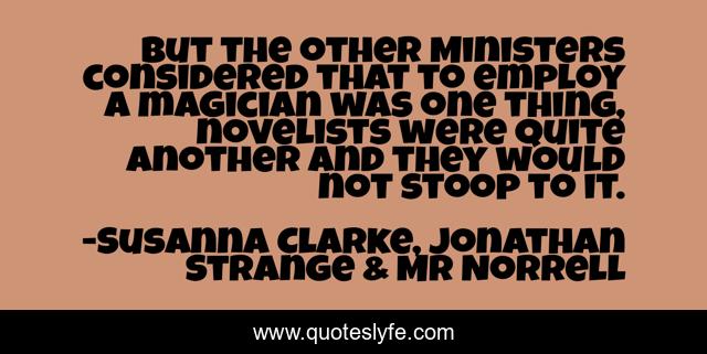 This page presents the quote "But the other Ministers considered that to employ a magician was one thing, novelists were quite another and they would not stoop to it.". Author of this quote is Susanna Clarke, Jonathan Strange & Mr Norrell. This quote is about magic, magicians, novelists,.