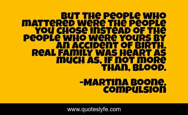 This page presents the quote "But the people who mattered were the people you chose instead of the people who were yours by an accident of birth. Real family was heart as much as, if not more than, blood.". Author of this quote is Martina Boone, Compulsion. This quote is about heart, relationship, family, martina-boone, bloodlines, relationships-with-kids, family-relationships, compulsion, real-family,.