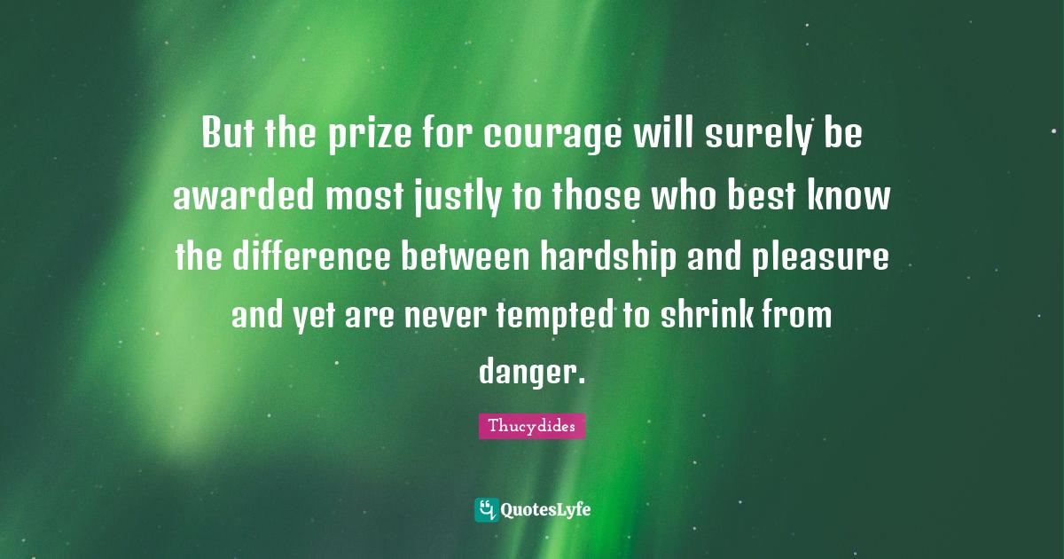This page presents the quote "But the prize for courage will surely be awarded most justly to those who best know the difference between hardship and pleasure and yet are never tempted to shrink from danger.". Author of this quote is Thucydides. This quote is about pleasure, courage, tempted, danger, hardship, prize, differences,.