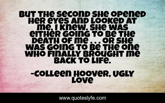 This page presents the quote "But the second she opened her eyes and looked at me, I knew. She was either going to be the death of me . . . or she was going to be the one who finally brought me back to life.". Author of this quote is Colleen Hoover, Ugly Love. This quote is about attraction, fear, confession,.