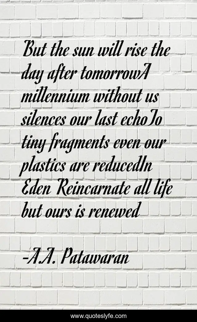 This page presents the quote "But the sun will rise the day after tomorrowA millennium without us silences our last echoTo tiny fragments even our plastics are reducedIn Eden Reincarnate all life but ours is renewed". Author of this quote is A.A. Patawaran. This quote is about climate-change, apocalypse, poetry,.