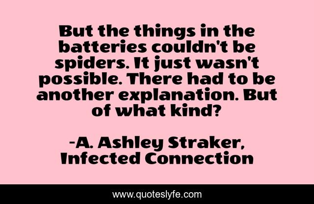 This page presents the quote "But the things in the batteries couldn't be spiders. It just wasn't possible. There had to be another explanation. But of what kind?". Author of this quote is A. Ashley Straker, Infected Connection. This quote is about arachnid, horror, technology, spiders, thriller,.