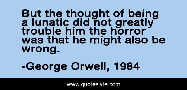 This page presents the quote "But the thought of being a lunatic did not greatly trouble him the horror was that he might also be wrong.". Author of this quote is George Orwell, 1984. This quote is about wrong, fear, lunatic,.