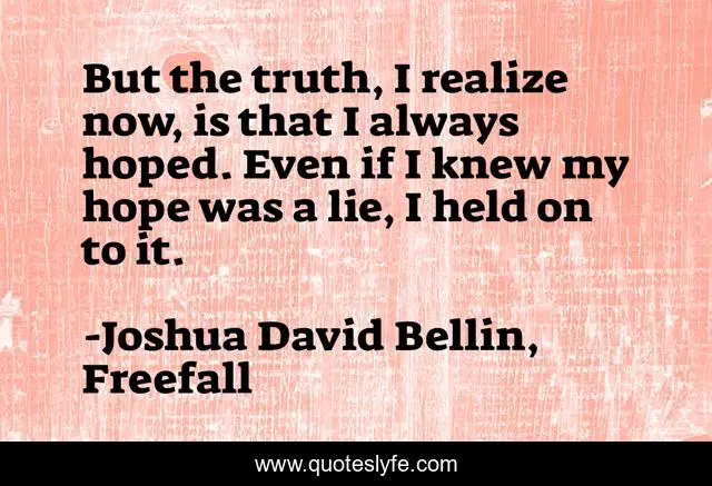 This page presents the quote "But the truth, I realize now, is that I always hoped. Even if I knew my hope was a lie, I held on to it.". Author of this quote is Joshua David Bellin, Freefall. .