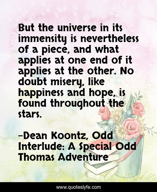 This page presents the quote "But the universe in its immensity is nevertheless of a piece, and what applies at one end of it applies at the other. No doubt misery, like happiness and hope, is found throughout the stars.". Author of this quote is Dean Koontz, Odd Interlude: A Special Odd Thomas Adventure. This quote is about universe, happiness, odd-thomas, full-circle,.