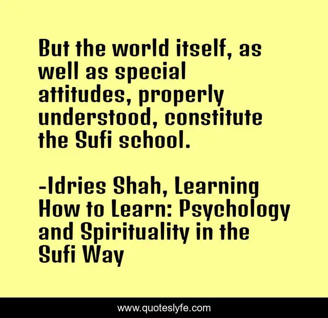 This page presents the quote "But the world itself, as well as special attitudes, properly understood, constitute the Sufi school.". Author of this quote is Idries Shah, Learning How to Learn: Psychology and Spirituality in the Sufi Way. This quote is about sufism, evolution, sufis, school, sufi-way,.