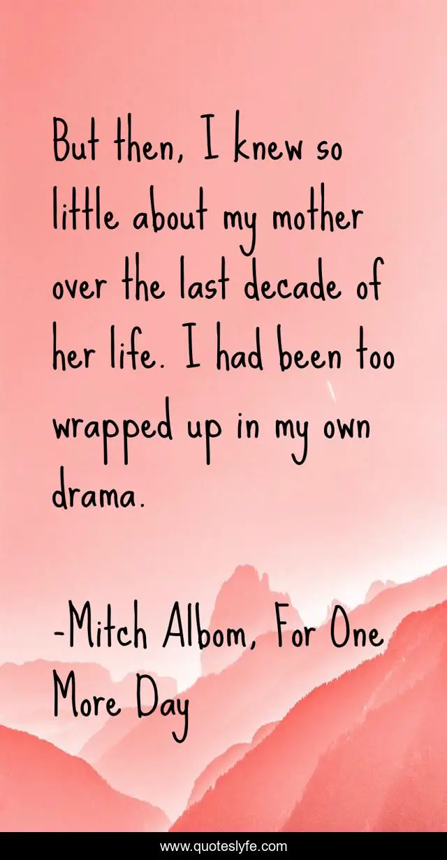 This page presents the quote "But then, I knew so little about my mother over the last decade of her life. I had been too wrapped up in my own drama.". Author of this quote is Mitch Albom, For One More Day. This quote is about drama, selfishness, mother,.