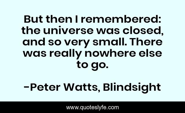 This page presents the quote "But then I remembered: the universe was closed, and so very small. There was really nowhere else to go.". Author of this quote is Peter Watts, Blindsight. This quote is about claustrophobia, universe,.