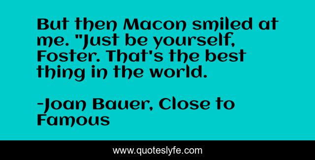 This page presents the quote "But then Macon smiled at me. "Just be yourself, Foster. That's the best thing in the world.". Author of this quote is Joan Bauer, Close to Famous. .