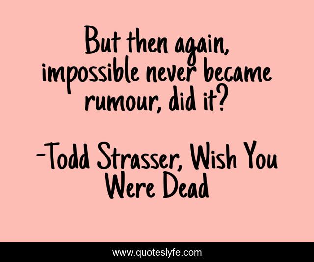 This page presents the quote "But then again, impossible never became rumour, did it?". Author of this quote is Todd Strasser, Wish You Were Dead. This quote is about mystery, rumour,.